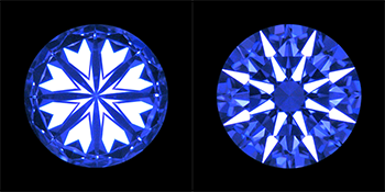 「ハート&キューピッド」とは、優れた対称性を持つダイヤモンドにのみ出現する現象です。最適なプロポーションと優れたシンメトリー(対称性)が揃うことで生み出され、専用のスコープで見るとダイヤモンドの表面と裏面に「8本の矢と、8つのハートの模様」を確認することができます。