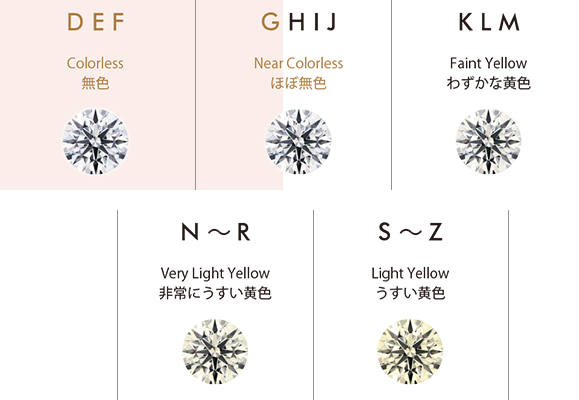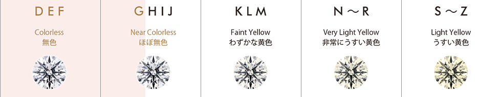 カラーは一般的に、無色透明に近いほど希少価値が高くなります。無色透明のカラーを最高のDとし、黄色みを帯びるに従ってZまでの全23段階に分けられます。いい夫婦ブライダルでは、ほぼ無色とされるG upのダイヤモンドを扱っています。