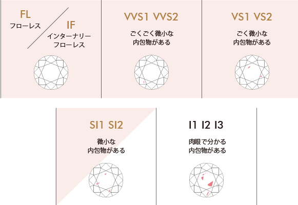 ダイヤモンドの中の、光の通過を邪魔する内包物やキズの程度を表します。専門家が適正な光源のもとで10倍拡大下で調べ、相対的に内包物やキズがどの程度少ないかを評価します。いい夫婦ブライダルではSI upのダイヤモンドを扱っています。