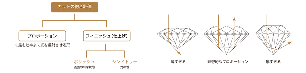 カットとはダイヤモンドの輝きや煌めきを決定づける一番大切な要素です。カットは、プロポーション(理想の形)とポリッシュ(表面の研磨仕上げ状態)、シンメトリー(対称性)の3つの要素を総合的に評価され、最高の「Excellent」から5段階でグレードの順位が決定します。