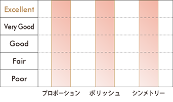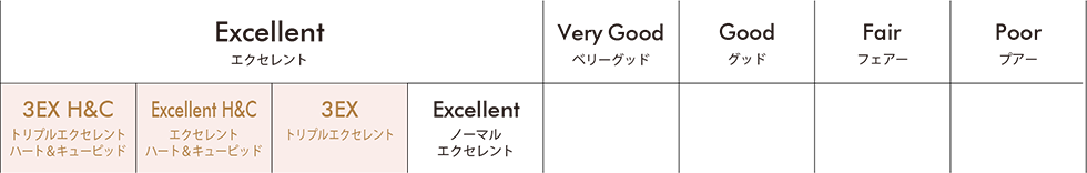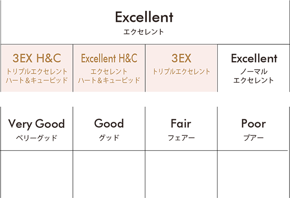 いい夫婦ブライダルはカットグレードがエクセレント(Excellent)の中でも、仕上げの要素評価と、ハート&キューピッドのパターン認定の有無の4段階に細分化して評価しています。