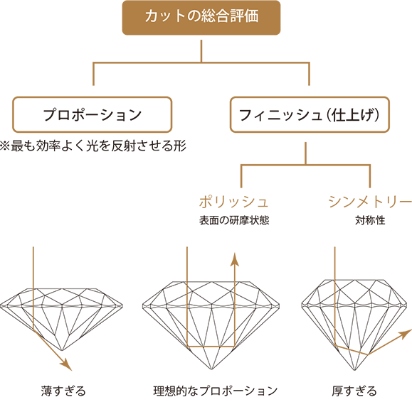 カットとはダイヤモンドの輝きや煌めきを決定づける一番大切な要素です。カットは、プロポーション(理想の形)とポリッシュ(表面の研磨仕上げ状態)、シンメトリー(対称性)の3つの要素を総合的に評価され、最高の「Excellent」から5段階でグレードの順位が決定します。
